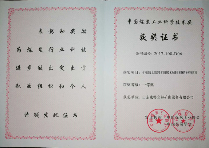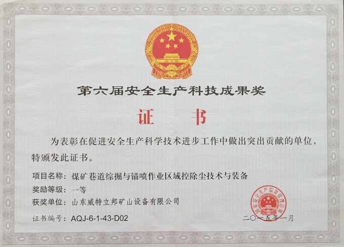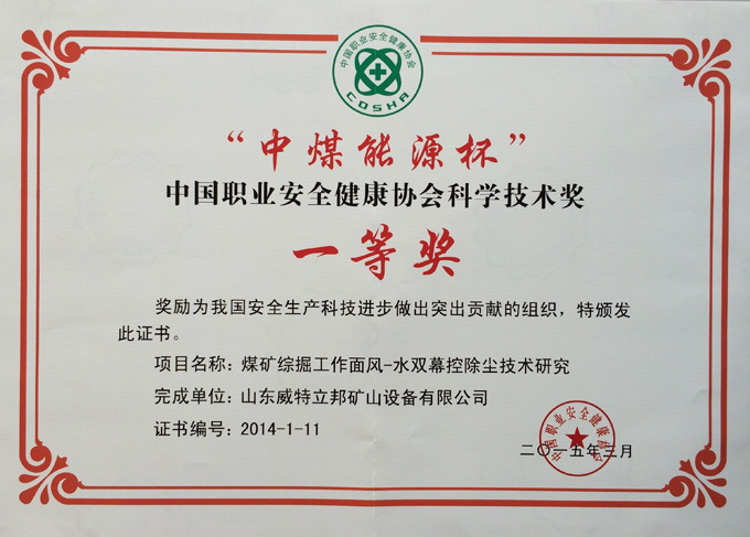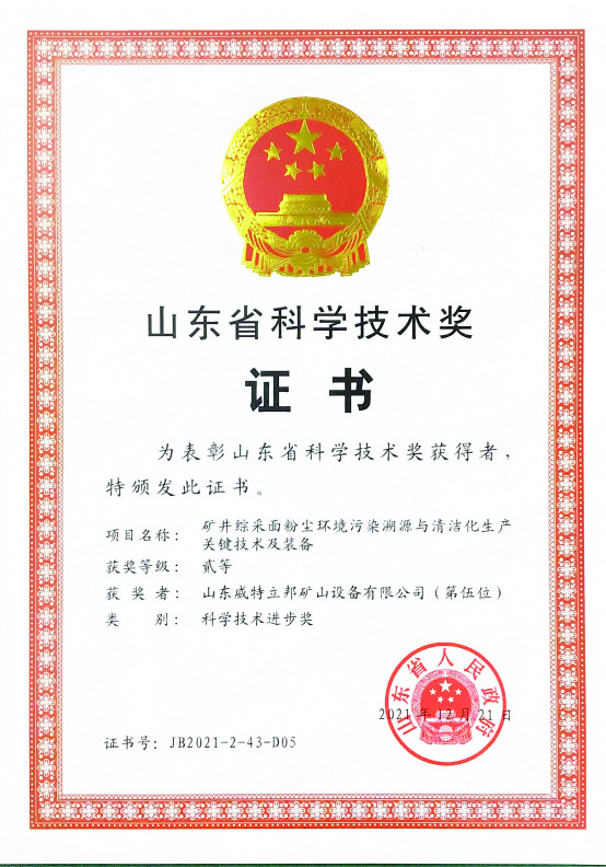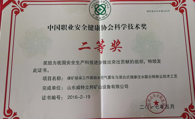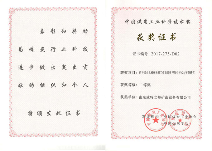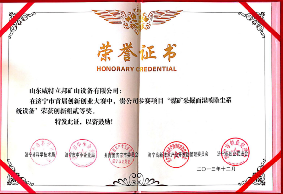 • 濟寧市首屆創(chuàng)新大賽“煤礦采掘面濕噴除塵系統設備”創(chuàng)新組二等獎